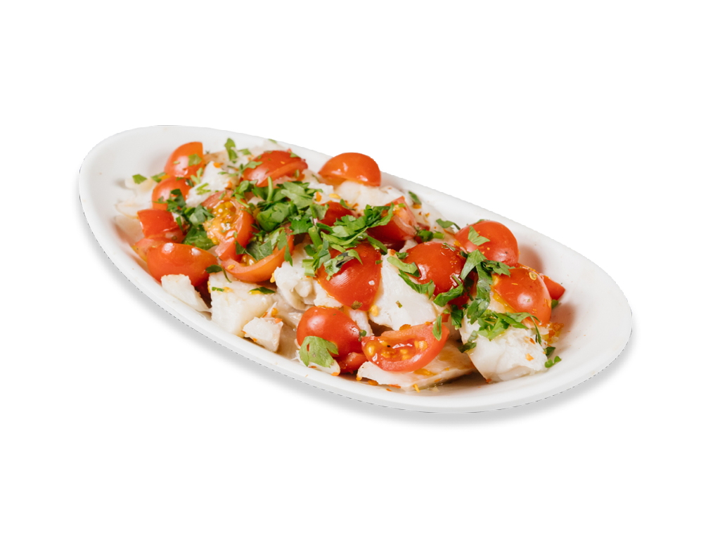 Ingredienti: Baccalà; Olio Evo; Pepe Rosso; Pomodoro; Prezzemolo